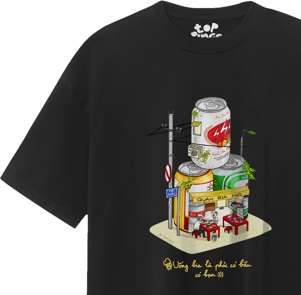 Mẫu thiết kế: UỐNG BIA CÓ BẠN CÓ BẦU là sản phẩm mà Toppings collab với EXTRABIOVN mừng sinh nhật CTY tròn 4 tuổi với thông điệp “ Luôn cần có nhau “ chính là minh chứng cho tinh thần gắn kết của mọi yếu tố trong Xã hội. Mẫu thiết kế là sự hóm hỉnh về tư duy hình ảnh cũng như ngôn từ: Lấy cảm hứng từ văn hóa bia hơi xưa cũ xa lắc, xa lơ kết hợp với phong cách trẻ trung hiện đại Miniature thu nhỏ mang hơi hướng vintage của các bạn trẻ khiến cho những bô lão Bụng Phệ ( có bầu ) đang nhâm nhi vài li bia hơi truyền thống được “ tàng hình “ vào chiếc quán nhỏ Decor hình những lon bia công nghiệp hiện đại của thế kỷ 21.