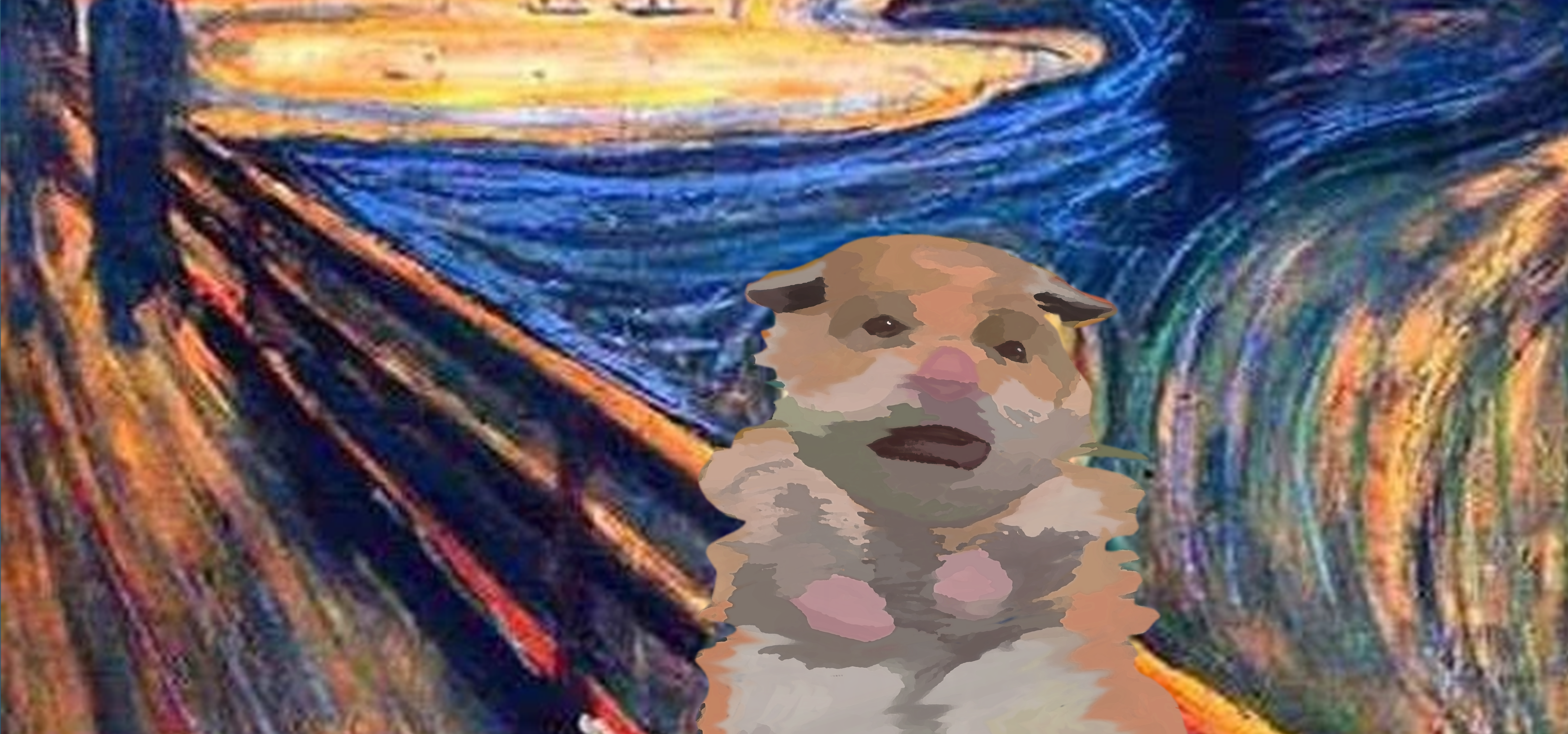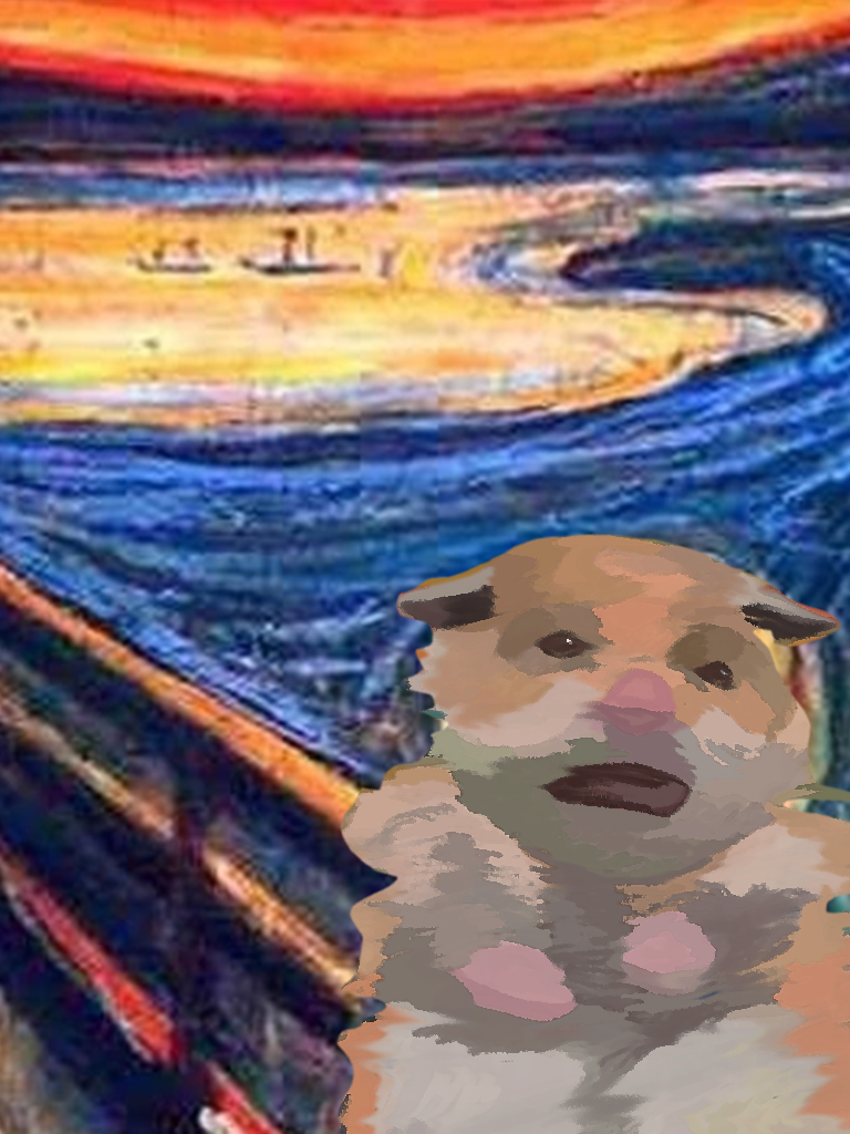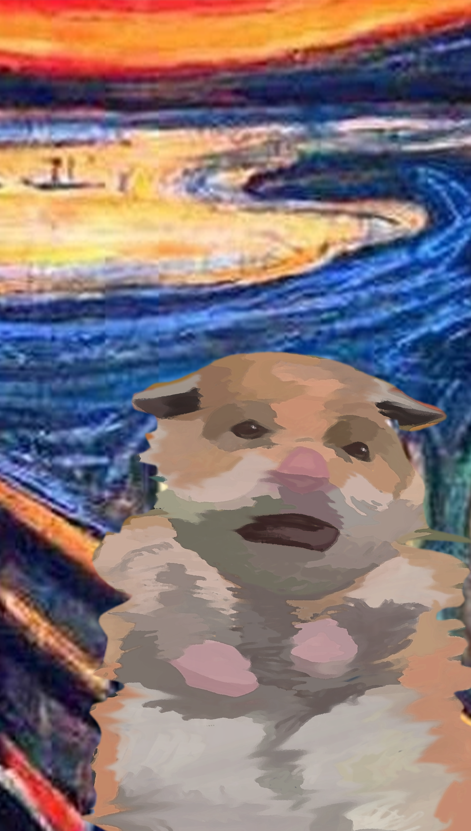 Hay như “Mỹ nữ hoảng hốt” mặc dù nguyên bản con chuột Hamster đã hoảng hốt rồi nhưng để điều đó càng nổi bật hơn thì chúng mình đã thêm thắt nền của bức tranh Tiếng hét vào.